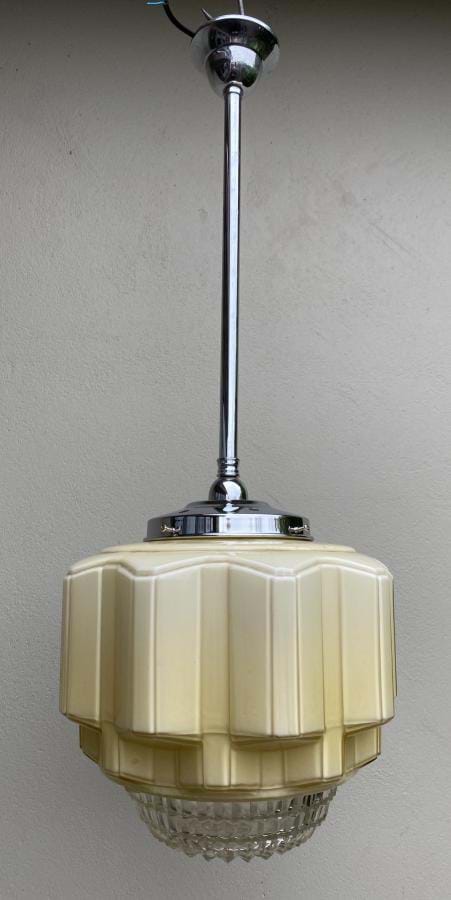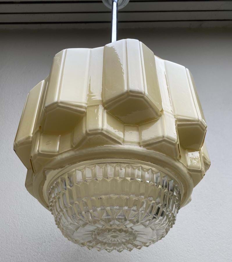 Large 1930's cream angular glass ceiling light shade with (removable) clear prismatic glass base. Comes with chrome rod suspension fittings and is ready to hang. Aged brass fittings also available if preferred. Shade is 310mm wide by 250mm long and the overall length/drop is approx. 850mm (which can be altered if requested).