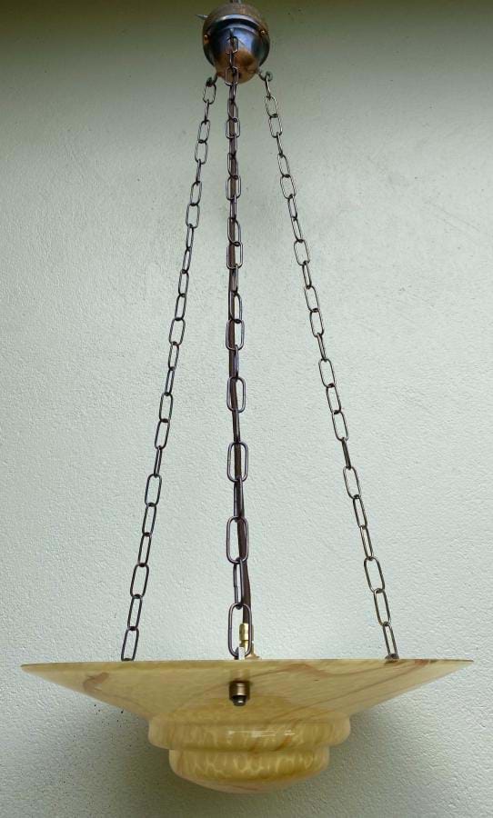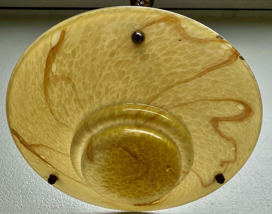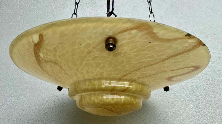 Large 1930's Czech deco moulded yellow glass ceiling light shade with caramel veining. Great shape and colour. Comes complete with re-wired 3 chain suspension fittings and is ready to hang. Shade is 350mm wide and the overall length/drop (adjustable) is approx. 800mm.