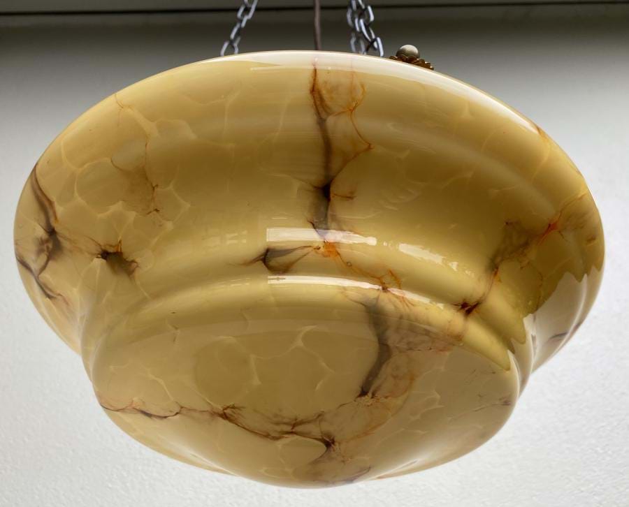 Large 1930s' moulded yellow glass ceiling light shade with caramel/orange veining. Attractive shape and colouring! Shade comes with re-wired 3 chain suspension fittings and is ready to hang. Measures 340mm wide and the overall length/drop (adjustable) is approx. 800mm.