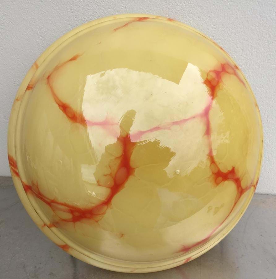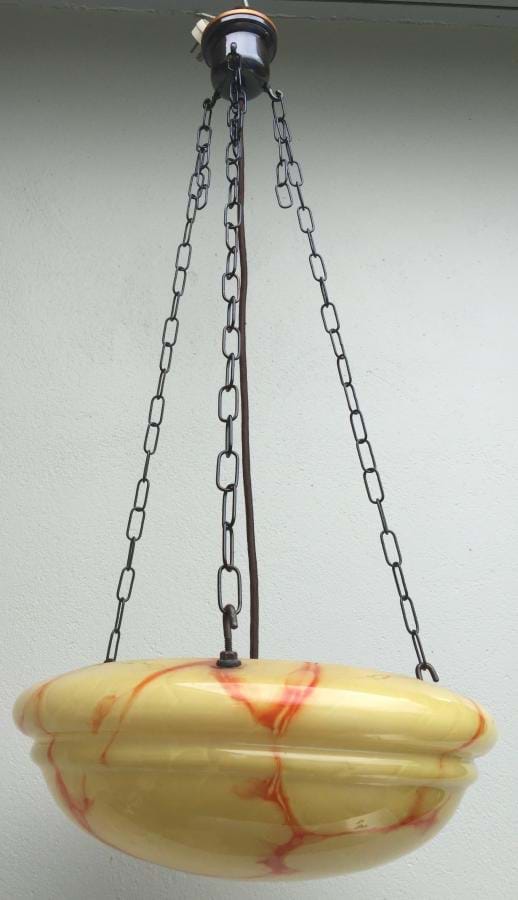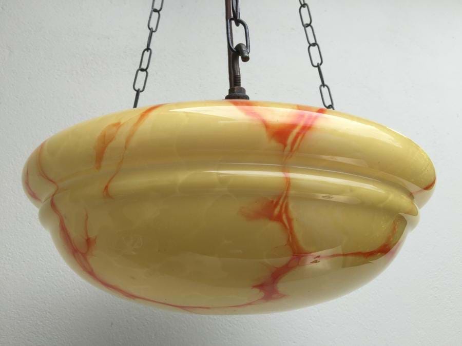 Large 1930's Czech deco yellow marbled glass ceiling light shade with red veining. Comes complete with re-wired 3 chain suspension fittings. Shade is 14 inches/360mm wide and the overall length/drop (adjustable) is approx. 800mm.