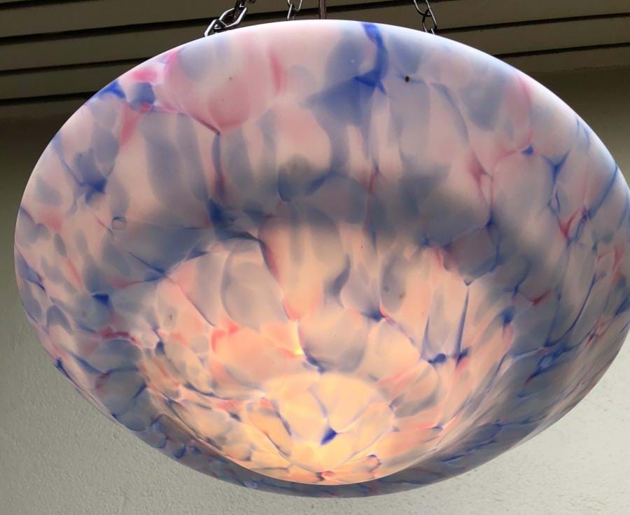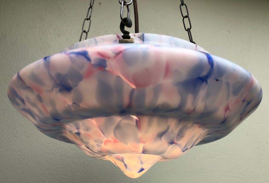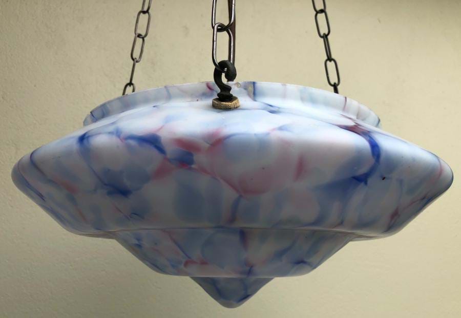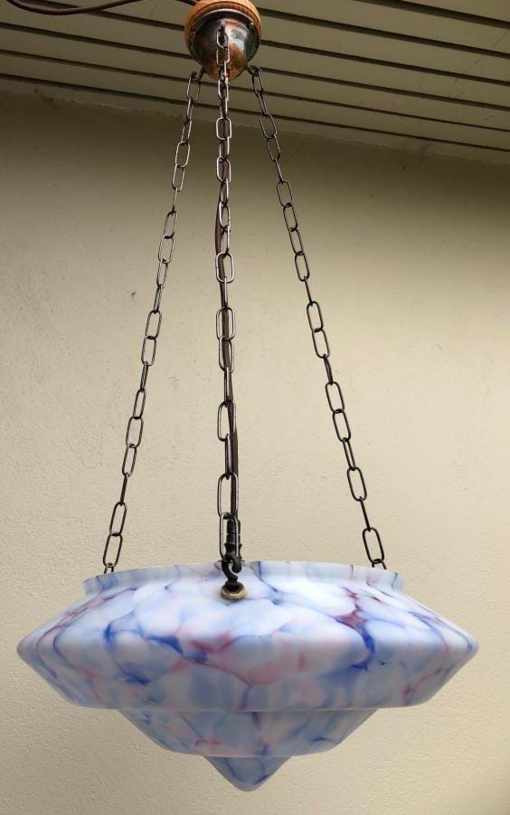 Quite beautiful large 1930's deco moulded glass ceiling light shade with white/blue/pink veining. Great shape and colour. Comes with re-wired 3 chain suspension fittings and is ready to hang. Shade is 350mm wide and the overall length/drop (adjustable) is 750mm. Ceiling cap is 100mm across.