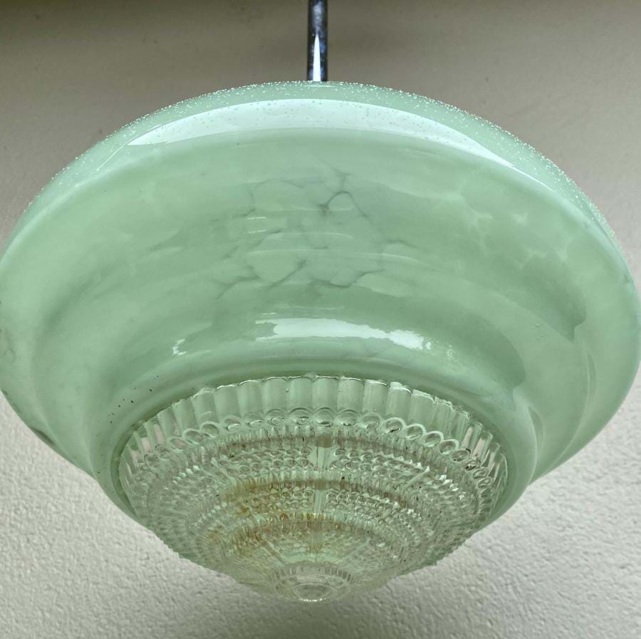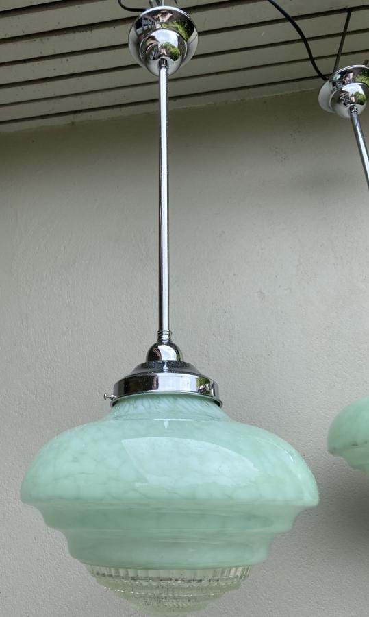 Great pair of large 1930's deco stepped marbled green glass ceiling light shades with clear (removable) prismatic glass bases. Come complete with chrome rod suspension fittings and are ready to hang. Each shade is 250mm wide by 140mm long and the overall length/drop is 700mm....which can be altered if requested. Price shown is for the pair.