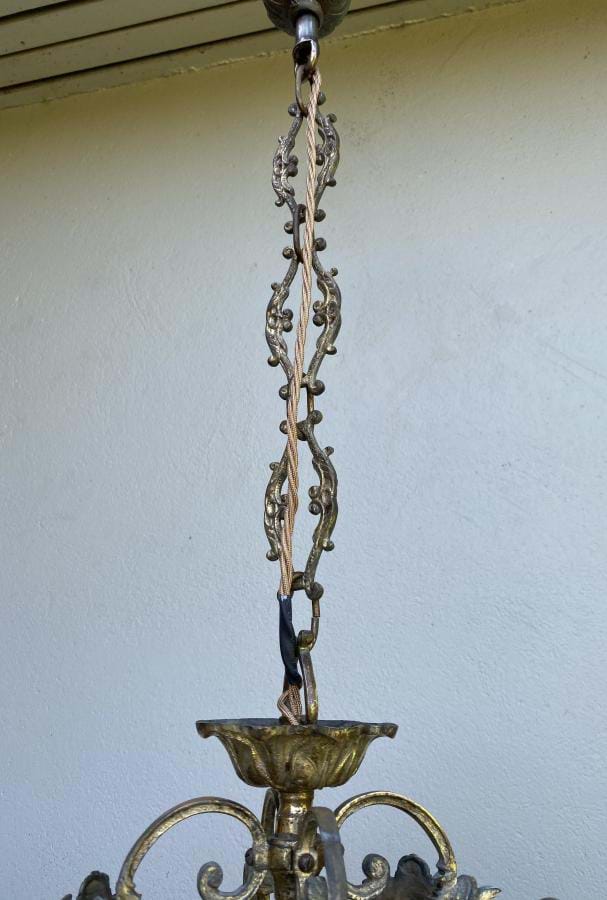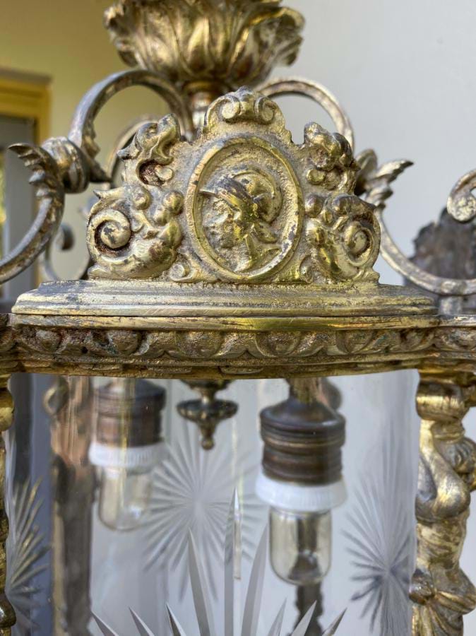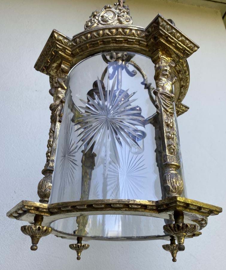 Large....and very solid...1930's/1940's French bronze lantern with cast figural decoration. Comes with its original clear cylindrical glass shade with wheel cut star pattern. Fully re-wired (takes two standard globes). Lantern is 400mm long by 290mm wide and the overall length/drop (adjustable) is 930mm. Cast ceiling cap is 80mm across.