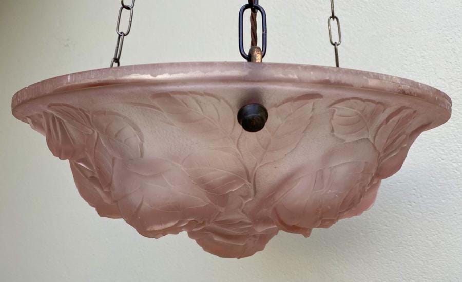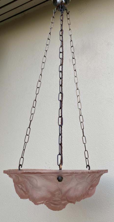 Large 1930's French Deco press moulded pink glass ceiling light shade with floral design. Shade comes with re-wired 3 chain suspension fittings and is ready to hang.