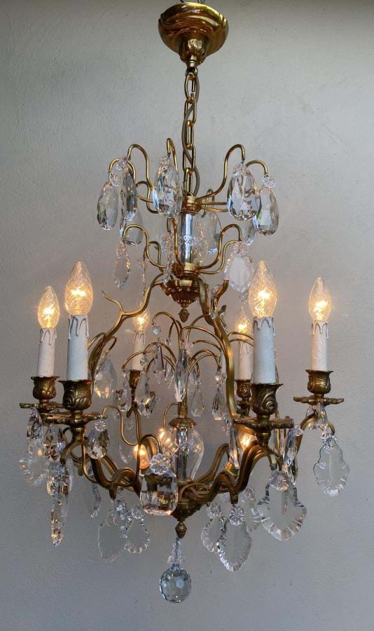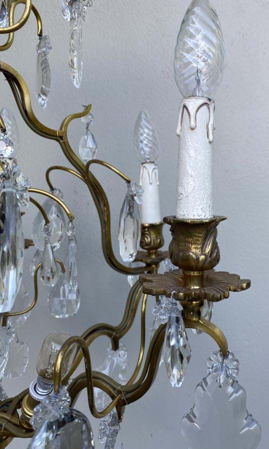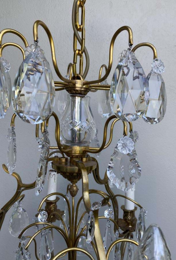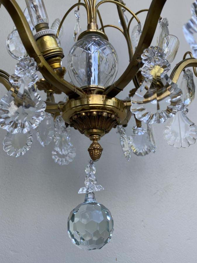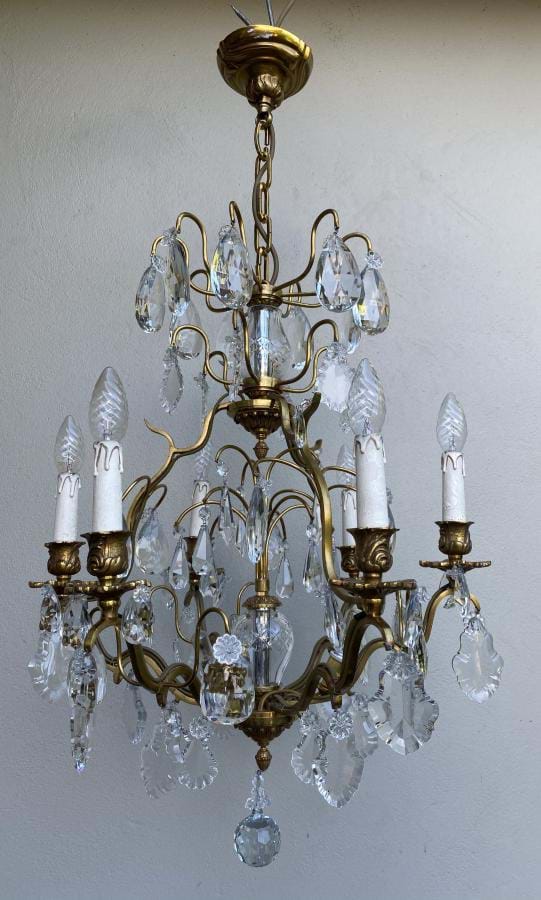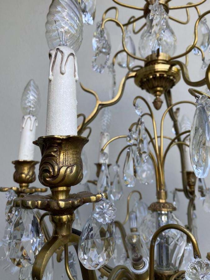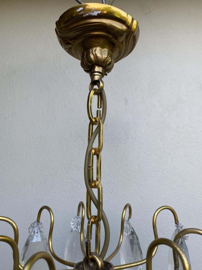 Superb large 1940's/1950's French bronze and crystal 9 light chandelier ( 6 arms/lights and 3 internal globes.). Fixture has a very attractive tiered design, with central glass inserts on the column and solid cast bronze fittings. Presented in excellent condition and fully re-wired. Measures 600mm wide and has an overall length/drop of 950mm. Cast ceiling cap is 130mm across.