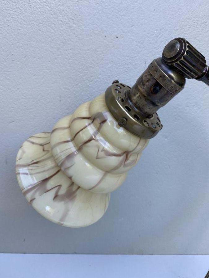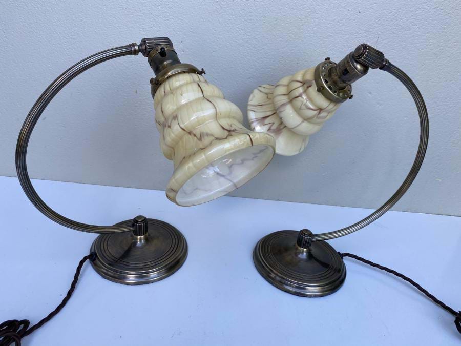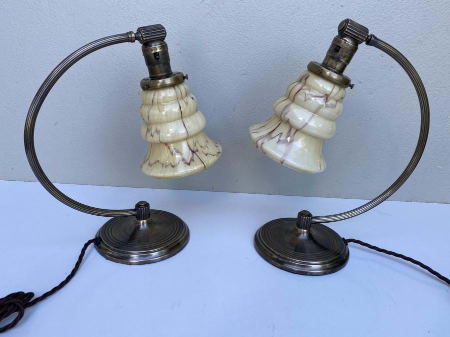 Lamps have a lovely patina and come with original stepped cream/brown glass shades.....which are adjustable for the desired lighting angle.