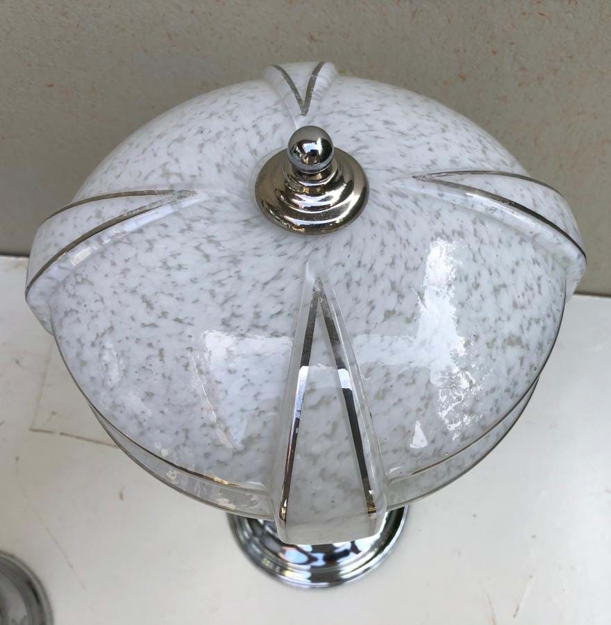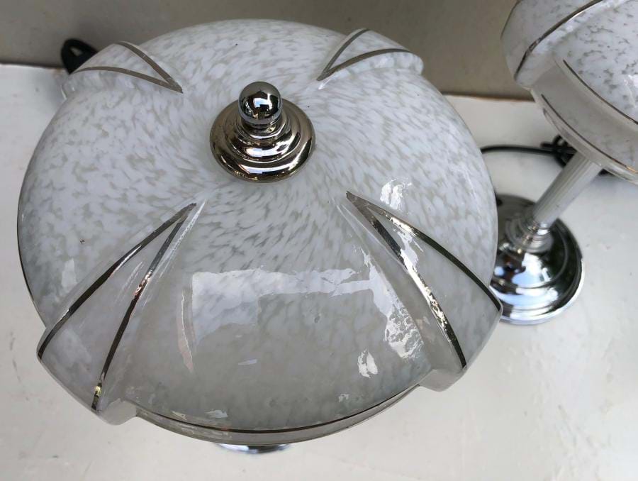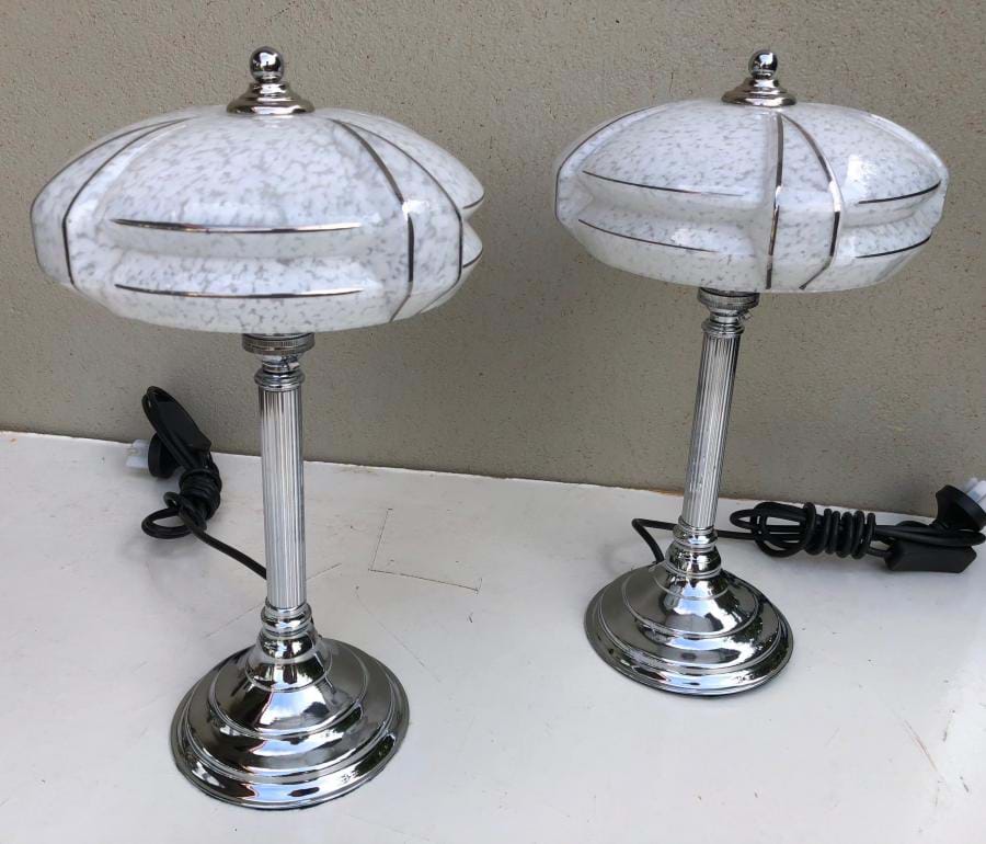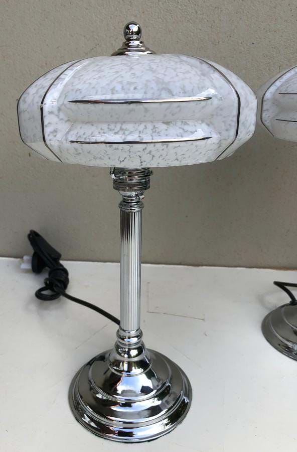 Pair of chromed solid brass reeded column lamps with original 1930's deco moulded off white glass shades with chrome edging. Great deco shape and design! Lamps are 350mm tall and the shades are 200mm wide. The (weighted) bases are 130mm across. Ideal as bedside or side lamps. Price shown is for the pair.