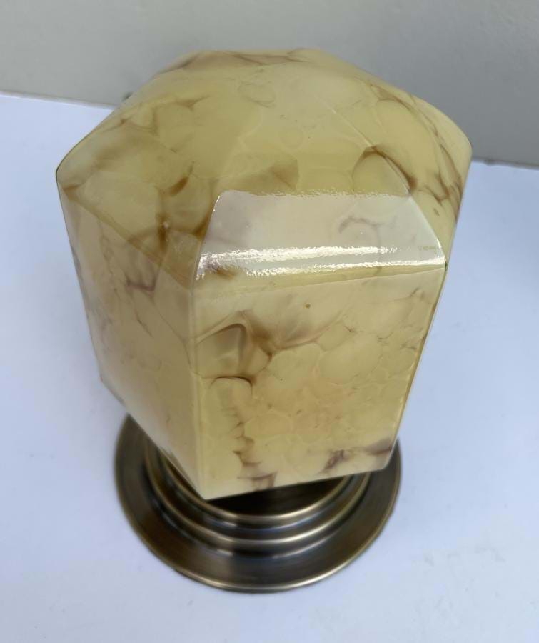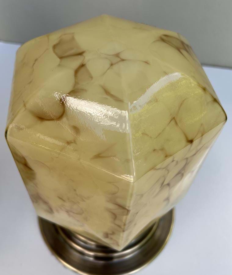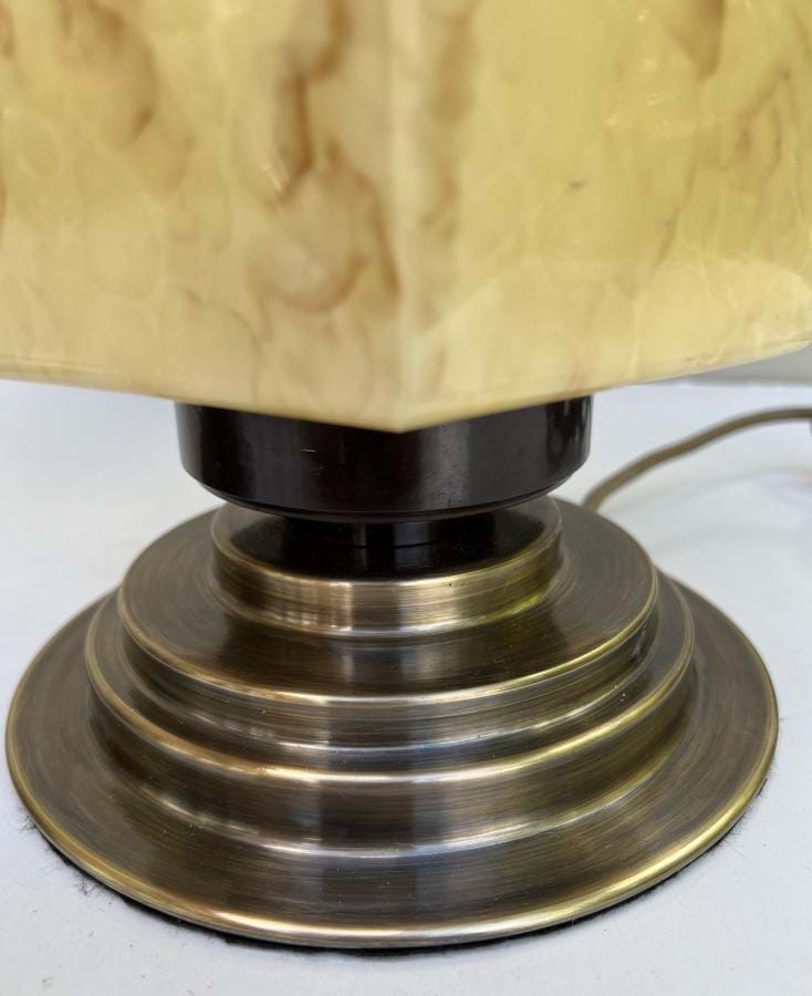 A great pair of German Deco stepped brass lamp base pair with original octagonal yellow/brown glass shades.