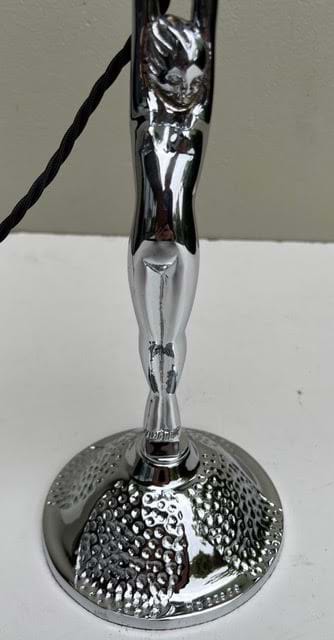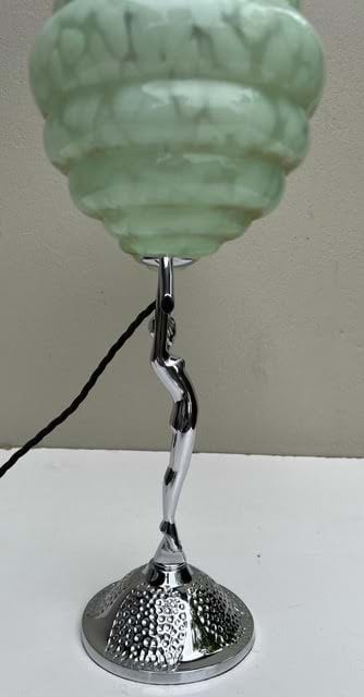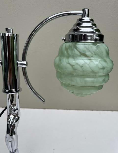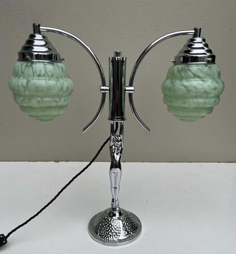 A very impressive 1930's Deco chromed brass double arm lady 'Diana' lamp with original green mottled glass shades.