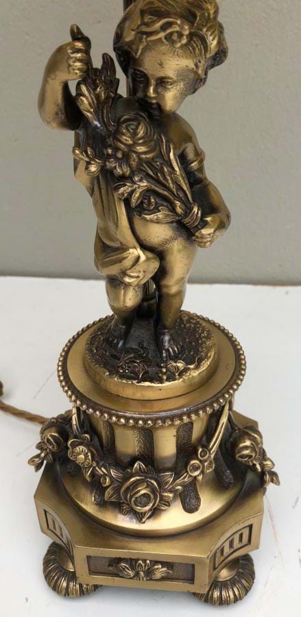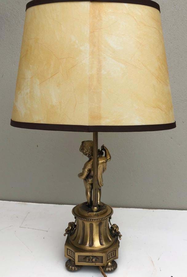 Attractive 1950's French cast/brass cherub lamp with parchment shade. Fully re-wired. Measures 510mm tall and the shade is 300mm wide. Cast base is 120mm square.