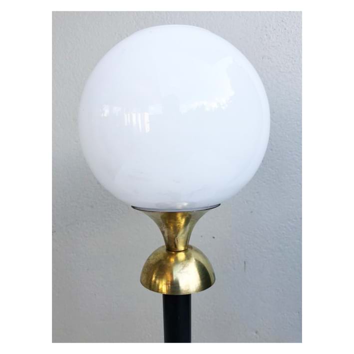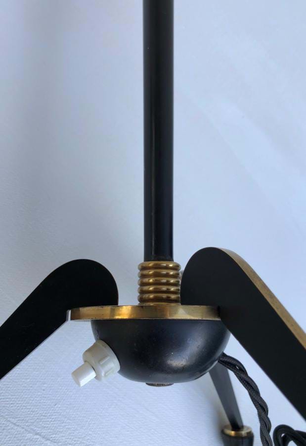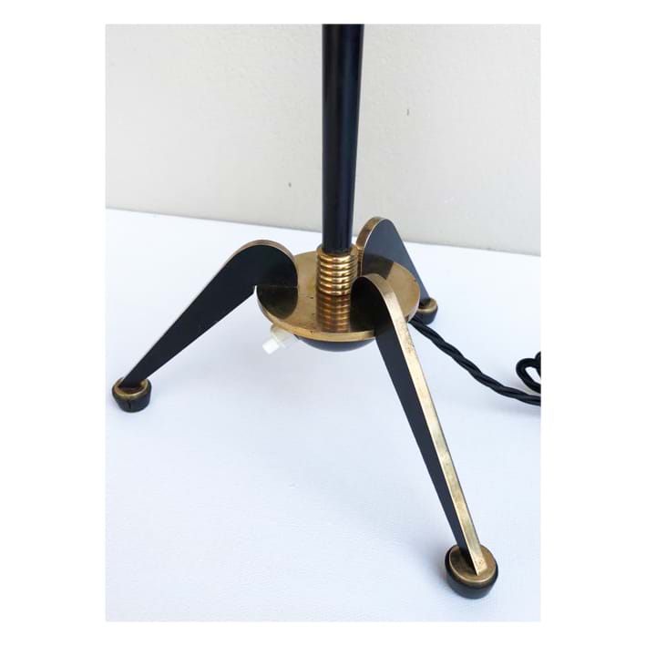 Striking tall....and scarce.... 1950's brass/black 'rocket' lamp with tripod feet by Stilnovo. Lamp is very well designed and made and comes with original white glass shade. Fully re-wired (on/off switch is on the underside of the base. Measures 530mm tall and the base is 200mm across. Shade is 130mm wide.