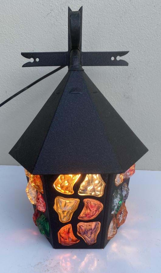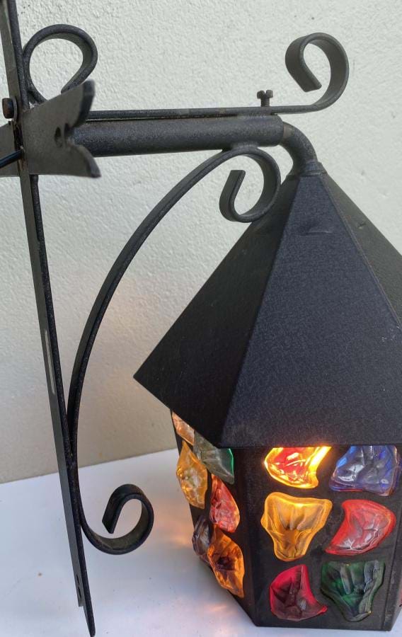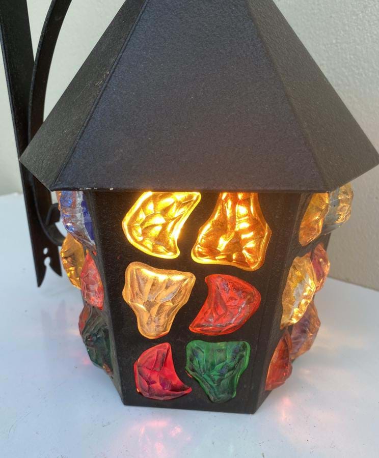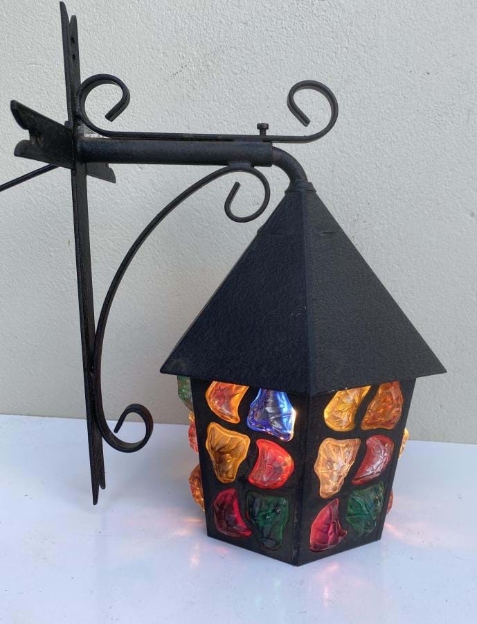 A fantastic 1930's English Deco black iron outdoor porch/wall light with coloured solid glass 'chunks'.........beautiful when lit up....and when off, for that matter!
